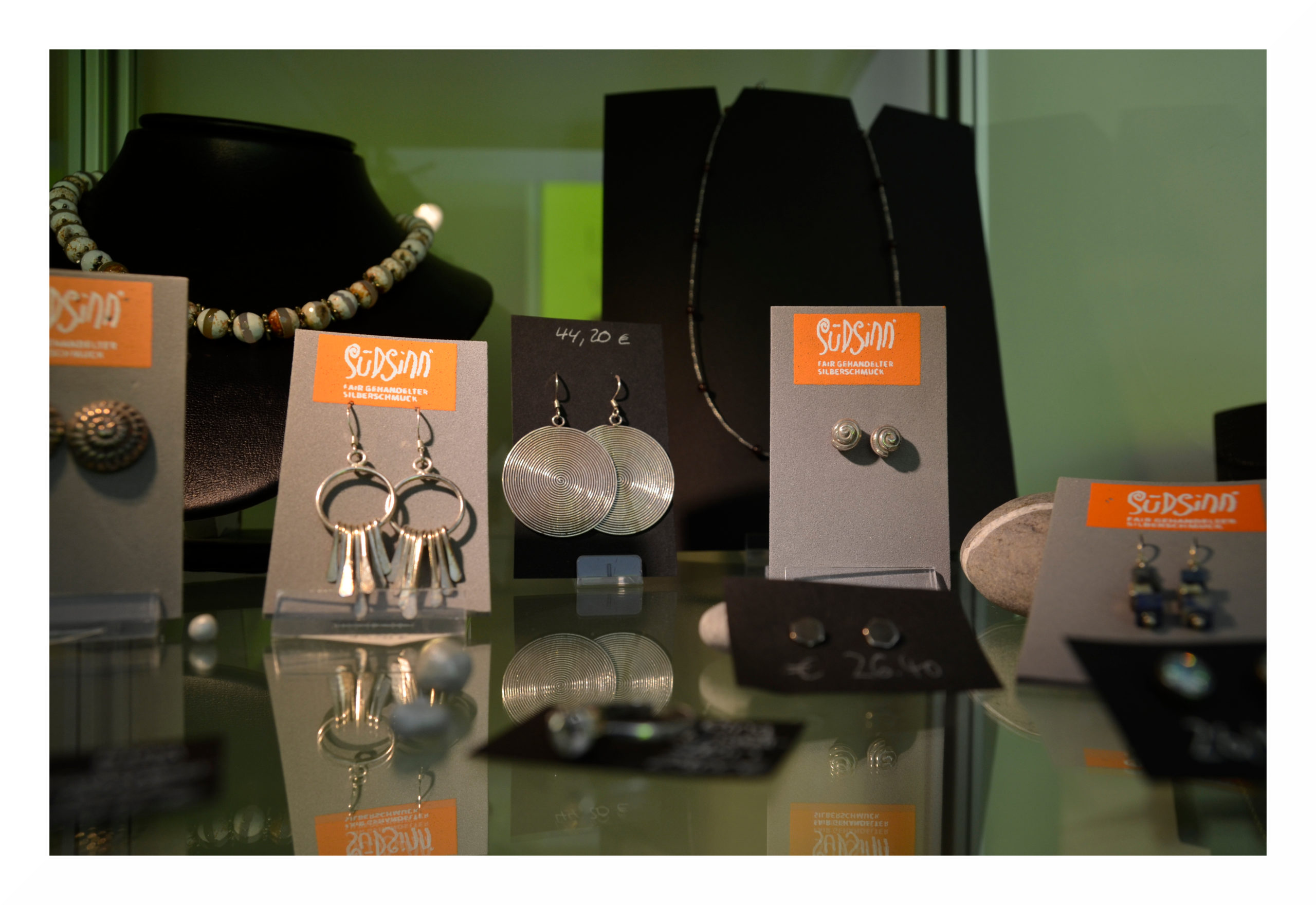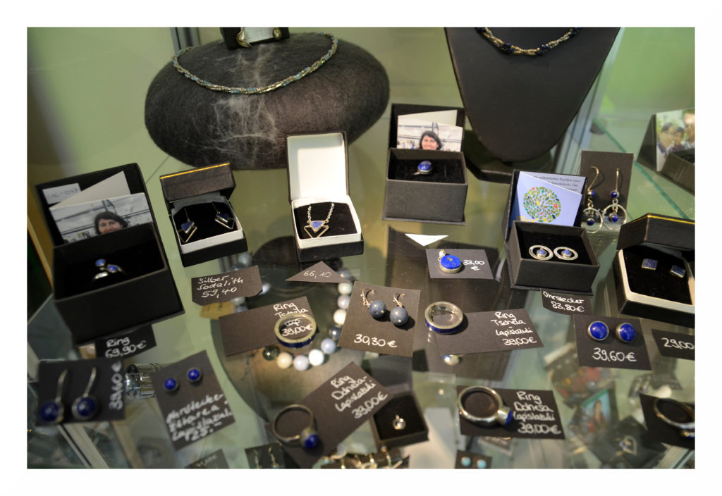 Aus Afghanistan stammt Silberschmuck mit (Halb-)Edelsteinen wie Lapislazuli, Mondstein, Serpentin, Karneol, Türkis oder grünem Achat. Die afghanische Kooperative NAZO bietet den Frauen nicht nur eine Ausbildung an, sondern auch Beratung und Weiterbildungen, z.B. Alphabetisierungskurse. Ein Kindergarten für die Kinder der Auszubildenden und ein Tiefbrunnen, der auch der Nachbarschaft sauberes Wasser liefert, gehören zu den Besonderheiten des Projektes.