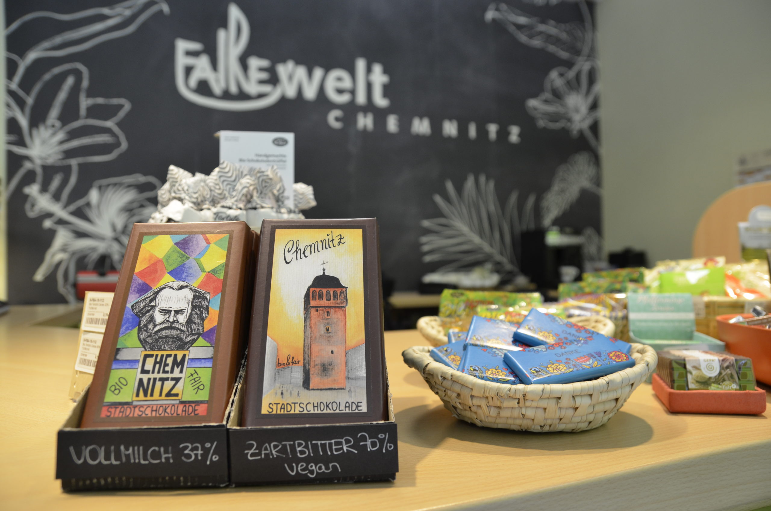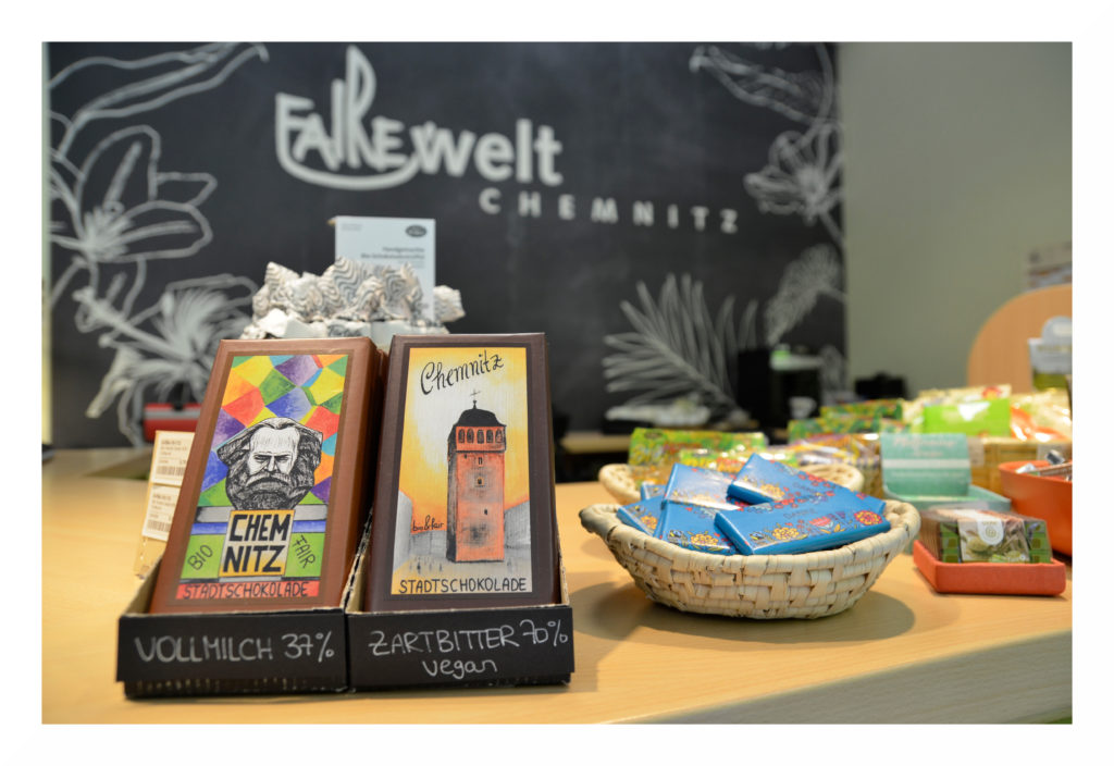 Highlights sind unsere Chemnitzer Stadtschokoladen, welche mit Designs der lokalen Sehenswürdigkeiten geziert sind. Auf der Vollmilchschokolade befindet sich der Karl-Marx-Kopf und auf der Zartbitter-Schokolade der Rote Turm. Beide sind von GEPA, fair und bio.