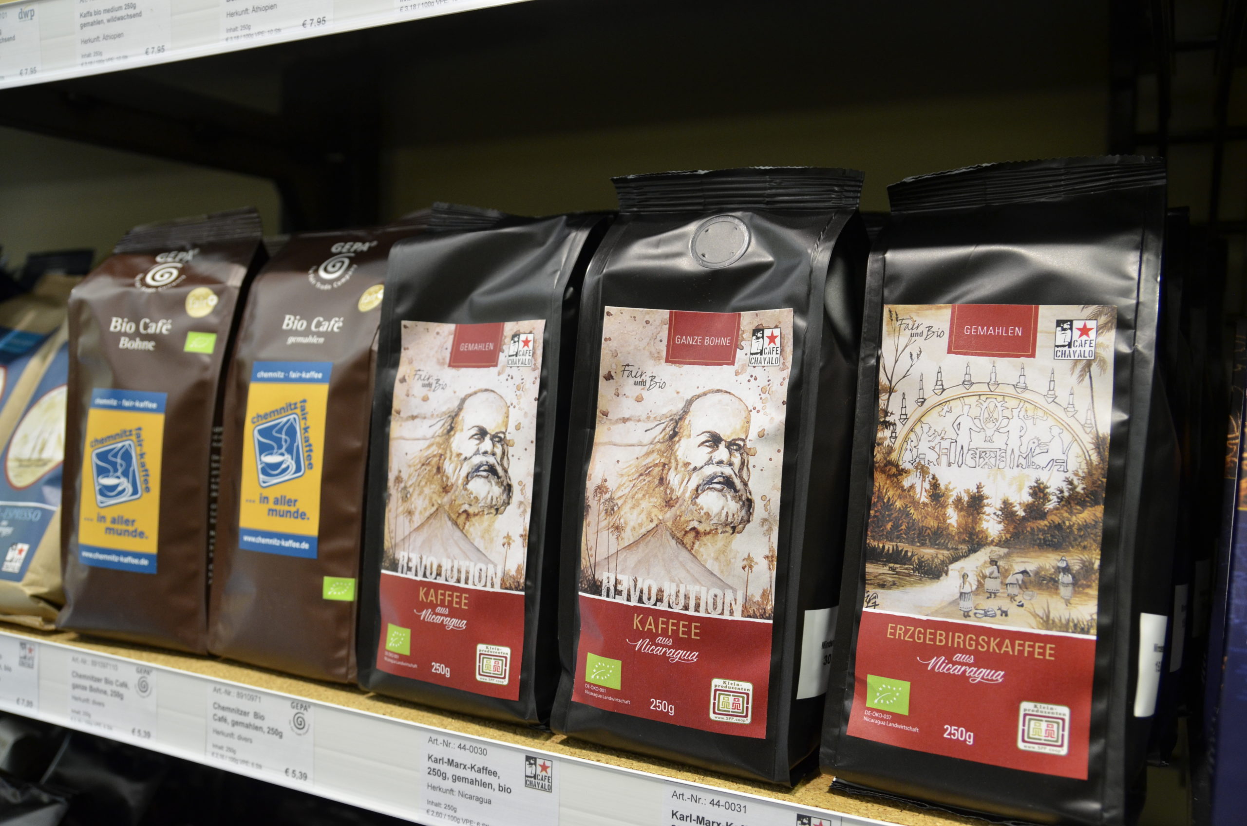 „Regionale“ Kaffees, also mit einem regionalen Design, sind unser Chemnitz-Fair-Kaffee von GEPA, dessen Design mit Bürgerbeteiligung entstanden ist, sowie der Revolutions-Kaffee mit einem Portrait von Karl Marx und der Erzgebirgskaffee.