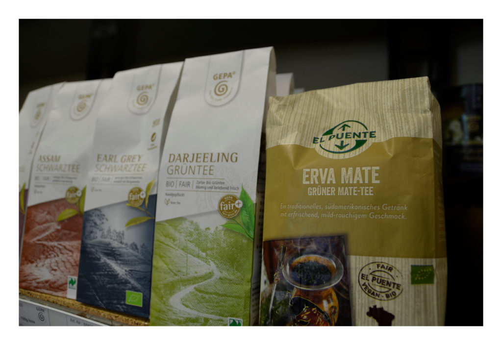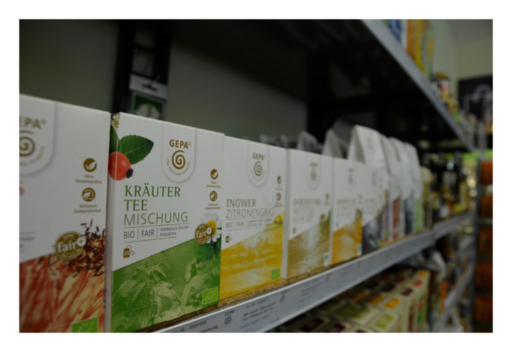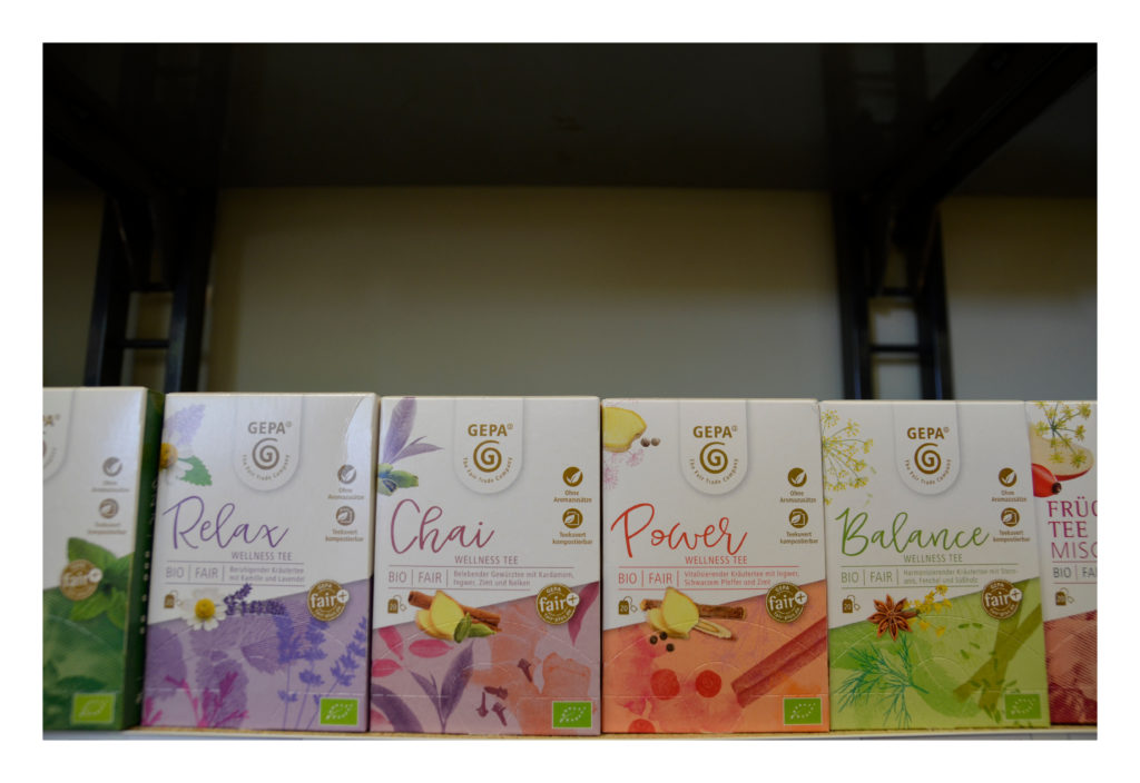 Auch Kräuter- und Früchtetees finden Sie bei uns. Außerdem gibt es zum Beispiel die Mischungen von GEPA: Chai- oder auch Relax-, Wellness- und Enjoy-Tee. Die Kräuter dafür stammen zum größten Teil aus Ägypten.