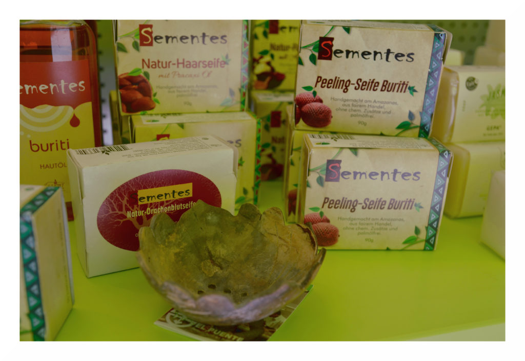 Wer gern auf die üblichen Shampoos verzichten möchte, dem bieten wir die vegane Natur-Haarseife von Sementes an. Diese kommt ohne Chemie, ohne Plantagen-Palmöl und vor allem ohne Plastikflasche aus. Aufgrund der Überfettung der Haarseife werden die Haare nach dem Waschen nicht strohig. Die Seifen von Sementes werden aus kaltgepressten Samen- und Fruchtölen im Regenwald am Amazonas handgefertigt.