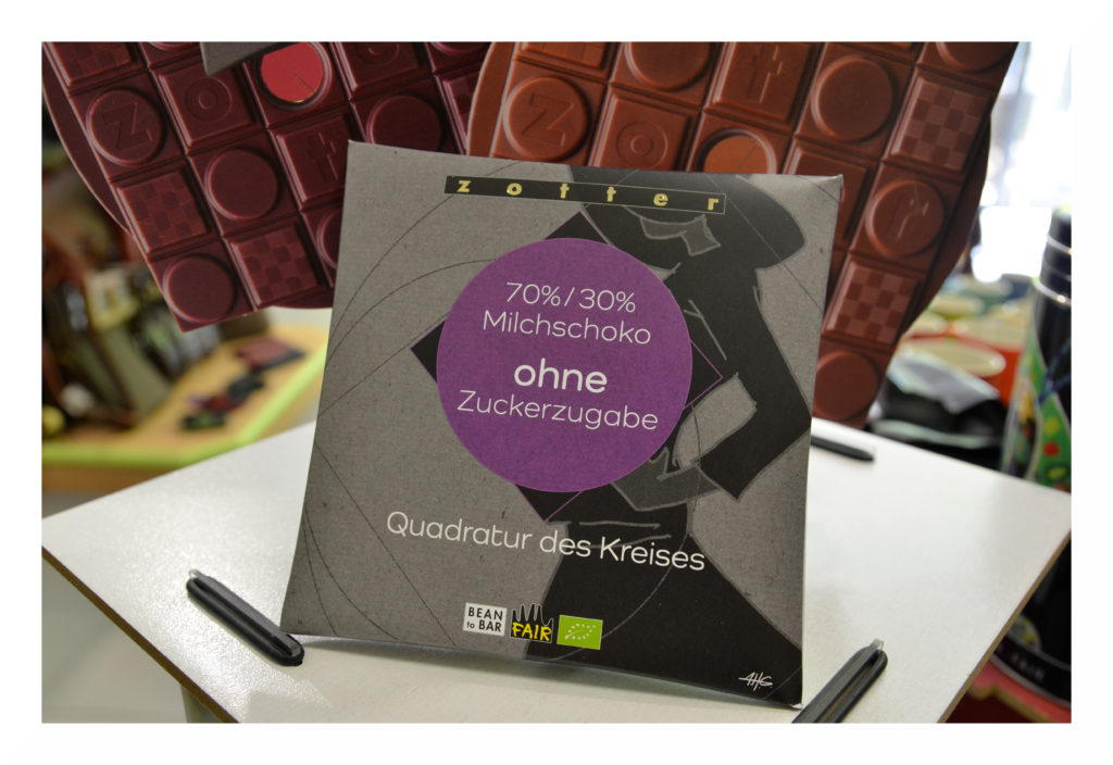 Die neue Schokoladenlinie „Quadratur des Kreises“ von dem österreischischen Chocolatier ZOTTER bietet 10 Sorten, welche sich rund um das aktuelle Thema Zucker drehen. Die „100% Dunkle Schoko“ kommt dabei ganz ohne Zucker aus. Die anderen Schokoladen erhalten durch Zuckeralternativen wie Kokosblütenzucker oder Erythrit ohne Kalorien den altvertrauten Geschmack.