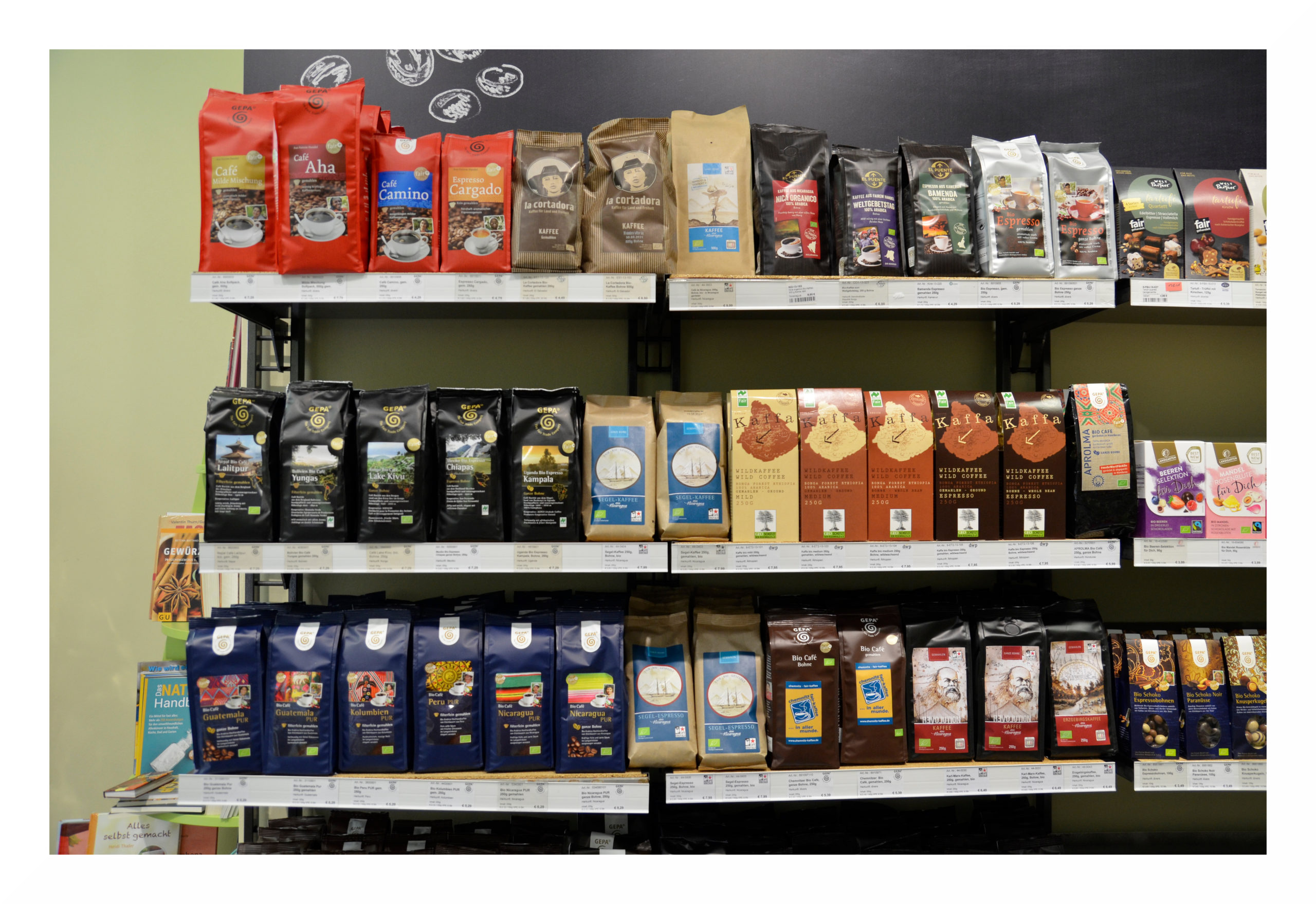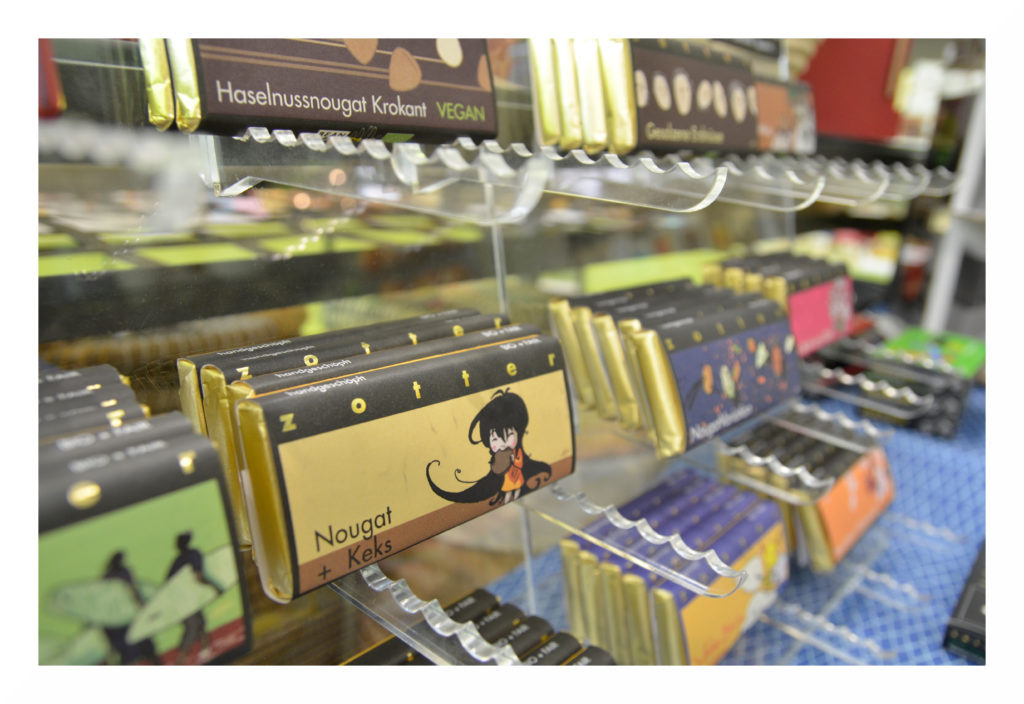 Ob ganz klassische Zartbitter-Schokolade von GEPA, exotische Kreationen von ZOTTER, vegane Nussschokolade, Weiße Mascobado- oder Vollmilchschokolade mit Gewürzen – auch in unseren Schokoladenregalen wird jeder fündig.