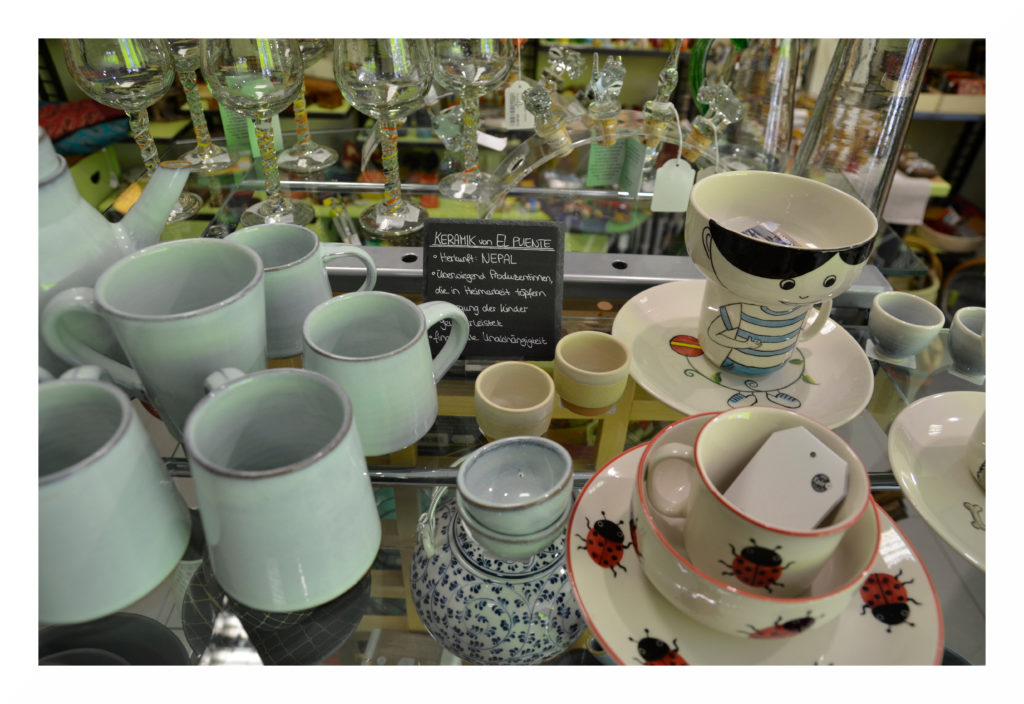 Unsere verschiedenen Tassen, Teller und Kannen aus Keramik beziehen wir aus Nepal oder Thailand, wo Kunsthandwerkerfamilien und besonders Kunsthandwerkerinnen unterstützt werden. Vor allem letzteren soll in den patriarchalen Strukturen zu mehr (finanzieller) Unabhängigkeit verholfen werden. Kleine Familienbetriebe bieten einem Teil der Landbevölkerung gesicherte Arbeitsverhältnisse. Neben dem festen Lohn und einer Tagesbetreuung für die Kinder erhalten die Angestellten in Thailand zum Beispiel Gesundheitschecks und Aufklärungsseminare. In Nepal gibt es für die Frauen die Möglichkeit der Heimarbeit, damit sie ihre Kinder versorgen können.