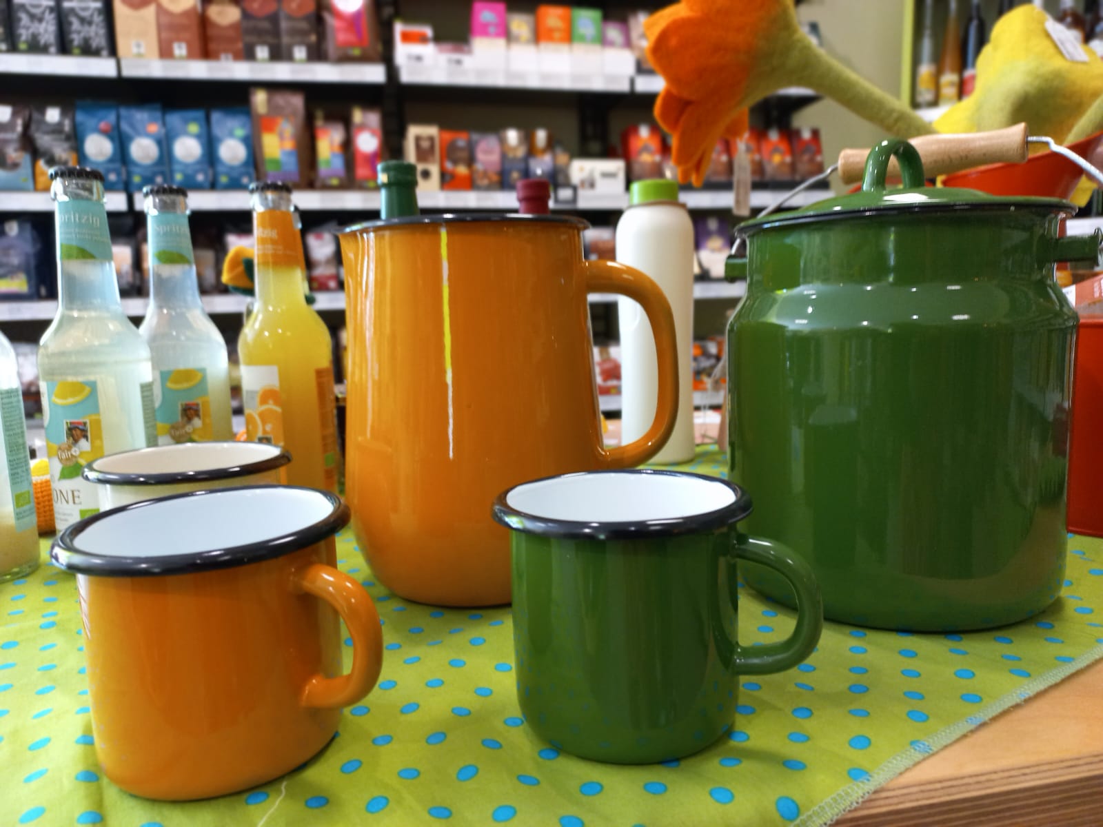 Farbenfroh, stilvoll und ziemlich retro stechen unsere neuen Tassen, Kannen und Krüge aus Emaille auf unserem Aktionstisch hervor. ☕✨ Außergewöhnlich ist dieses Mal auch die Herkunft der Handwerkswaren: Moogoo Creative Africa importiert das Emaille-Geschirr aus der Ukraine, genauer aus dem vom Krieg erschütterten Dnipro. Damit ermöglicht es der Faire Handel, Menschen in Krisengebieten über das reine Spenden hinaus zu unterstützen. 🕊️