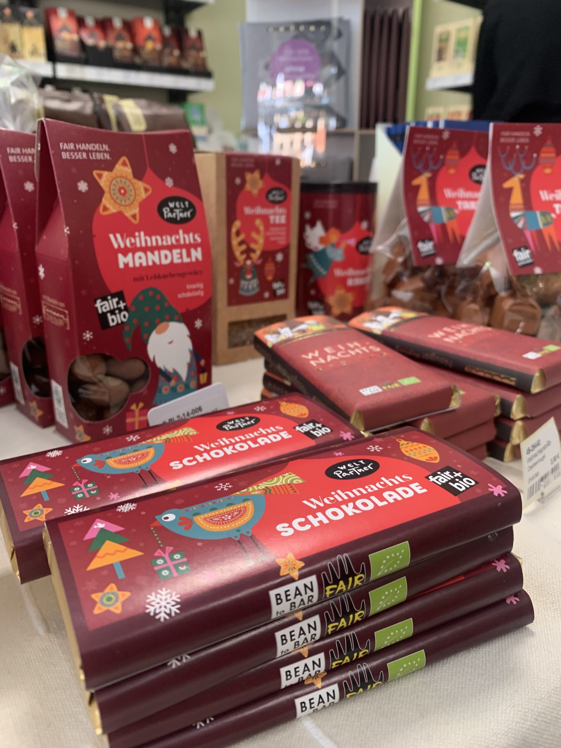 Wir sind auf der Zielgeraden zum Weihnachtsfest. Dabei darf aber eins nicht fehlen: die Weihnachtsleckereien. Von Schokoladen über Keksen zu Glühwein und feinsten Pralinen haben wir alles im Angebot. Darüber hinaus stammen auch  all unsere Produkte aus fairem Handel.