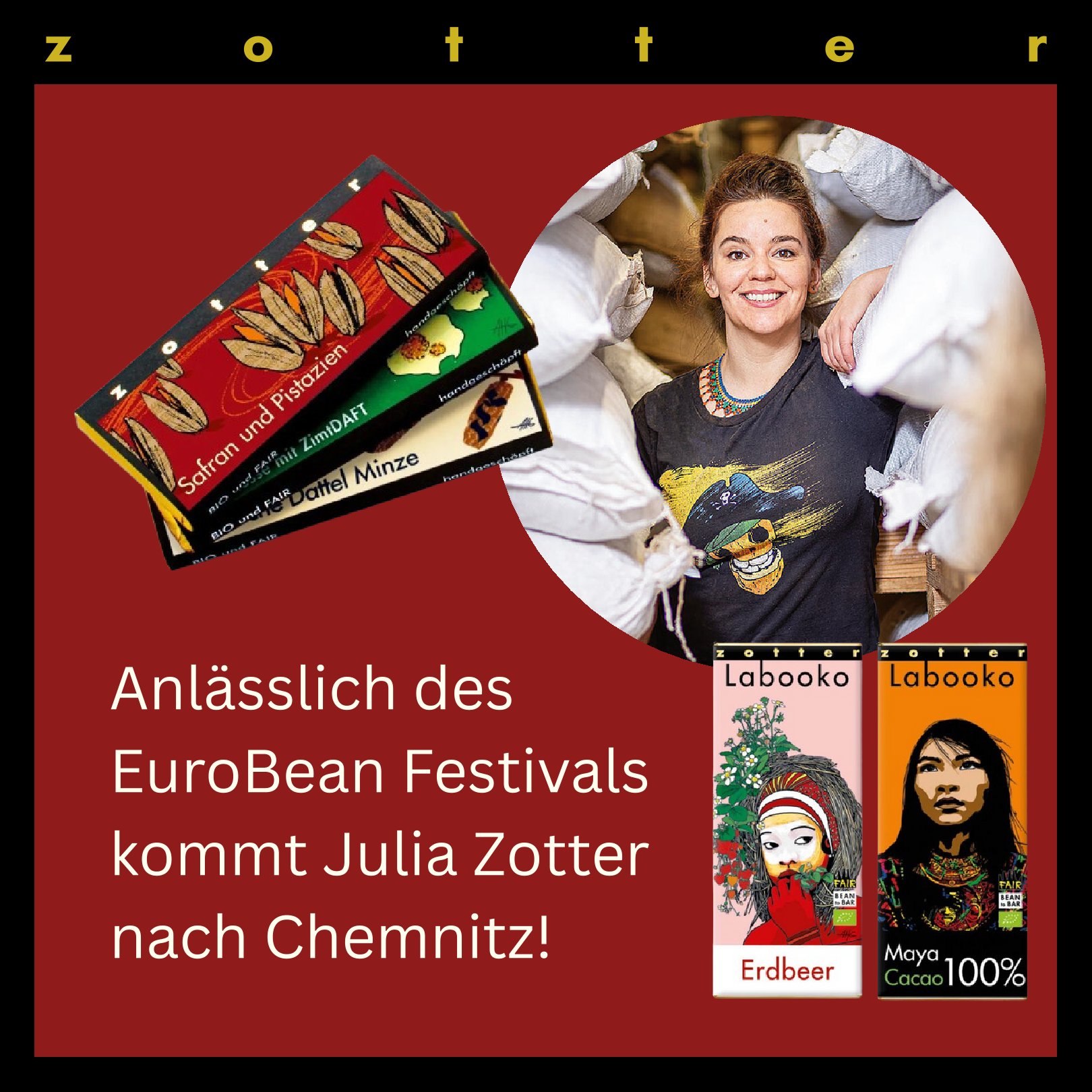 Am 01.08. besucht uns Julia Zotter im Weltladen Chemnitz! Anlässlich des EuroBean Chocolate Festivals kommt die Leiterin der Zotter-Niederlassung in Shanghai in die Kulturhauptstadt. Am Freitag wird sie von 15 bis 18 Uhr bei uns im Laden vor Ort sein und Schokoladen verkosten, aber natürlich auch für Gespräche mit euch offen sein!