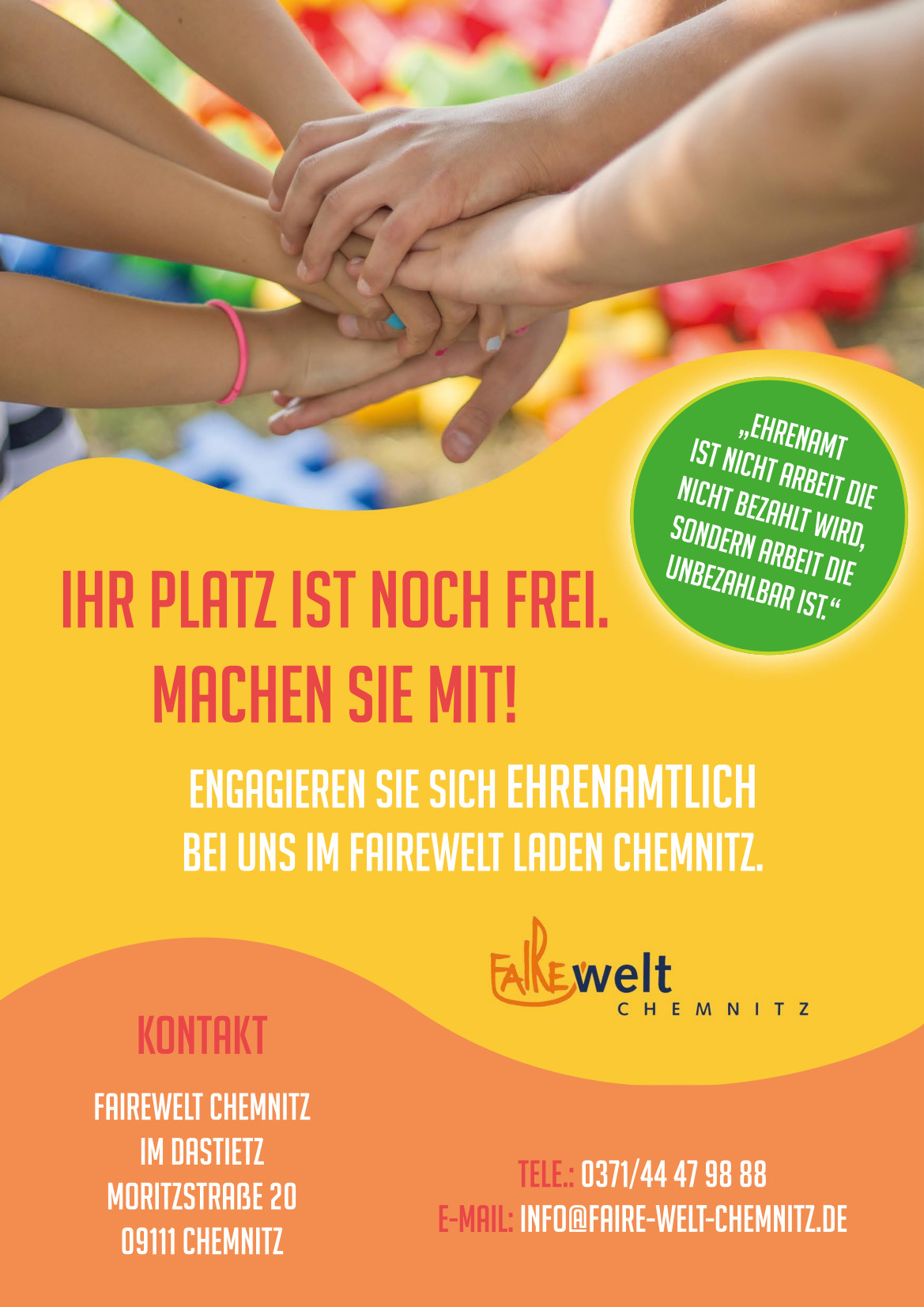 In der FAIRENwelt Chemnitz packen viele Ehrenamtliche mit an: Sie machen die Ladenschichten, betreuen Verkaufsstände und organisieren Veranstaltungen rund um den globalen Handel. Wir brauchen jederzeit sowohl kreative Organisationstalente als auch freundliche Verkäuferinnen und Verkäufer, die alle der Wille eint, die Welt ein Stück mehr zu einer FAIRENwelt zu machen .