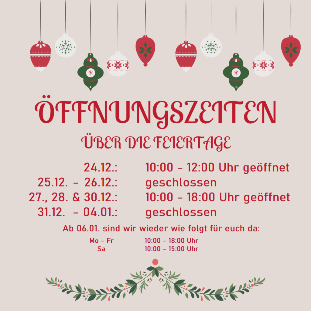Über die Feiertage haben wir wieder veränderte Öffnungszeiten, die ihr gern dem Bild entnehmen könnt.