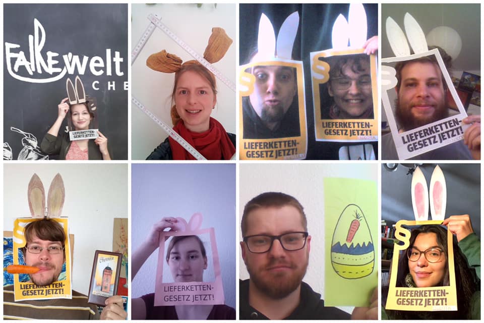 Trotz der schwierigen Situation momentan haben wir dieses Jahr einige Osteraktionen umsetzen können. Durch die Corona-Pandemie ist die Forderung nach einem Lieferkettengesetz aktueller denn je, da vor allem die benachteiligten Produzenten und Produzentinnen im globalen Süden am meisten beeinträchtigt werden. In deren Ländern gibt es ein deutlich schlechteres Gesundheitssystem, keine Sozialversicherung und viele haben keinerlei Rücklagen. Somit bedroht diese globale Krise diese Menschen ganz besonders. Das Lieferkettengesetz könnte Menschen in solchen Situationen schützen, da dies alle Unternehmen dazu verpflichtet, entlang der oftmals globalen Lieferkette die Menschenrechte einzuhalten und auf Umweltschutz zu achten. Der Faire Handel geht hier mit gutem Vorbild voran und verpflichtet sich seit vielen Jahren freiwillig zur Einhaltung dieser Standards.