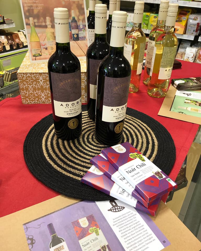 Diese vier Schokolade-Wein-Kombinationen sind unser Produkt des Monats September. Sie stammen aus einer Zusammenarbeit zwischen GEPA und dem Weinimport Riegel. Gemeinsam haben sie mehrere Sorten des Bioweins auf fair gehandelte Schokoladensorten abgestimmt, für das volle Geschmackserlebnis. Vier davon könnt ihr jetzt (gemeinsam oder getrennt) bei uns bekommen.