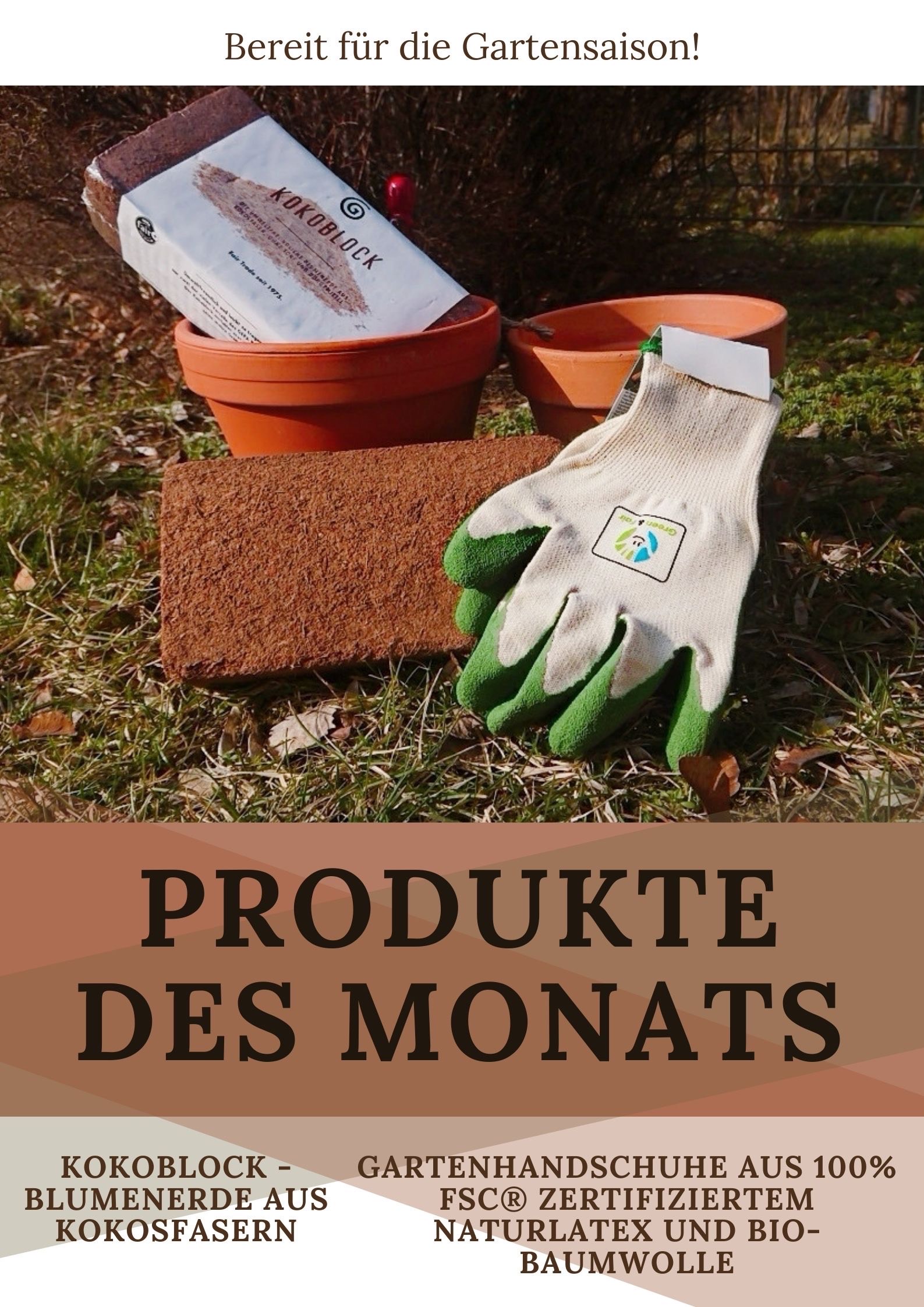 Pünktlich zu Beginn der Gartensaison haben wir gleich zwei Produkte des Monats für euch ausgesucht: nachhaltige Blumenerde aus Kokosfasern, den sog. Kokoblock, und faire Gartenhandschuhe aus Naturlatex und Biobaumwolle. Nur im April bekommt ihr auf beide Produkte jeweils 10% Rabatt!